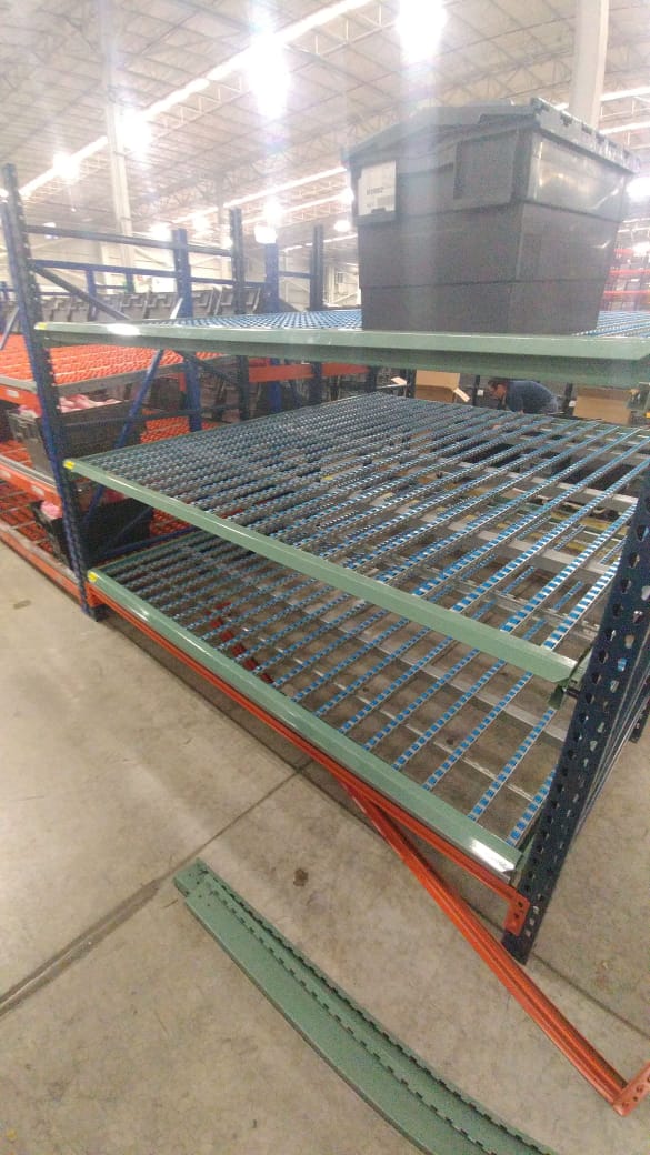 Racks formados por plataformas inclinadas de roldanas o rodillos que grantizan la óptima entrada y salida del material. La mercancía se introduce por un extremo y se desliza por gravedad, hasta el lado contrario que da al pasillo de salida. De esta forma permiten la perfecta rotación del producto, se evita interferencias en las tareas de reposición y recogida del material y aumenta la rapidez en la preparación de pedidos. Para agilizar la recogida de material pueden incorporarse dispositivos pick to light